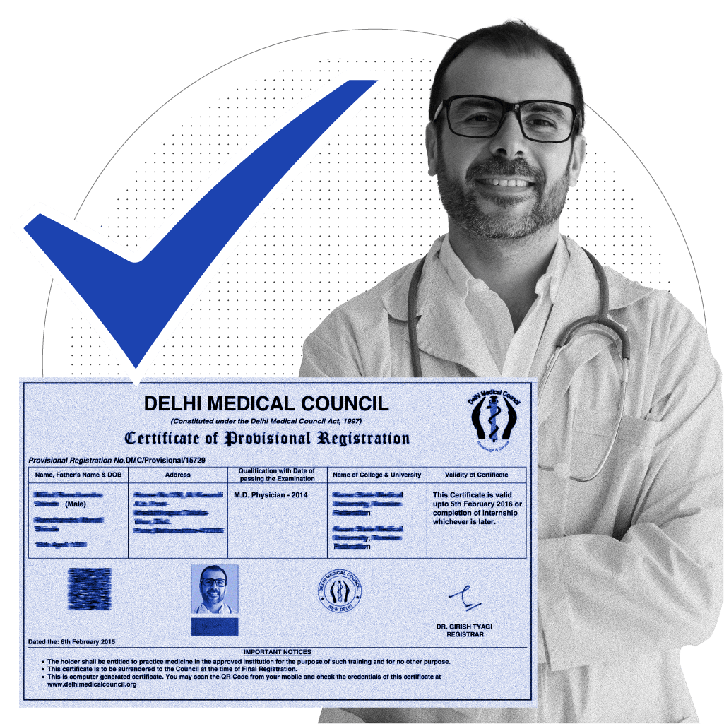 Provide registration number, council name and year of registration as input, and verifies if a registration number is correct along with the other details of a doctor present in the certificate.